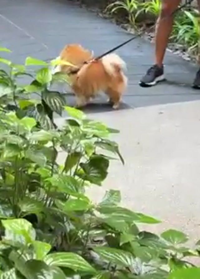 small, fluffy, reddish-brown Pomeranian dog on a leash being walked on a paved path. A man wearing a black t-shirt and dark patterned shorts holds the leash. A woman in a light blue patterned dress stands nearby. The Pomeranian is briefly approached by a white and brown dog. Lush green plants line the edge of the path. In the background, there's a building with glass and metal accents.