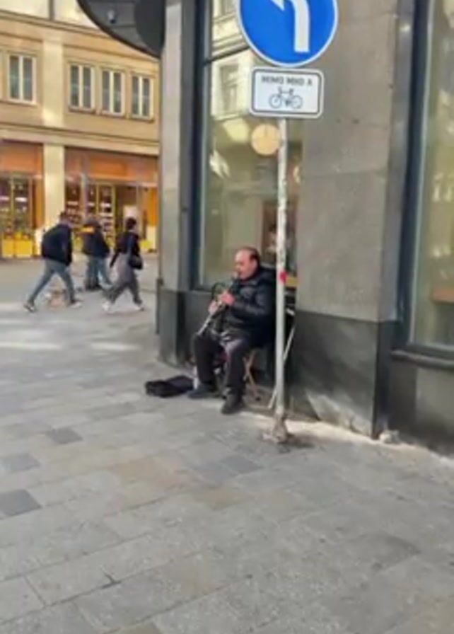 man playing a clarinet on a city street. He is seated on a chair under a street sign indicating a left turn and a bicycle route. He's wearing a dark jacket and pants. A black case lies on the ground beside him. People walk past on the paved street. Shops line the street in the background. The weather appears sunny. The camera angle shifts to capture more of the street scene with pedestrians.