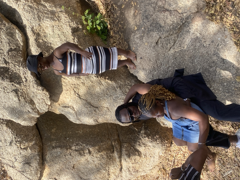 Three individuals are situated in an outdoor rocky environment in Nabatum, Nigeria