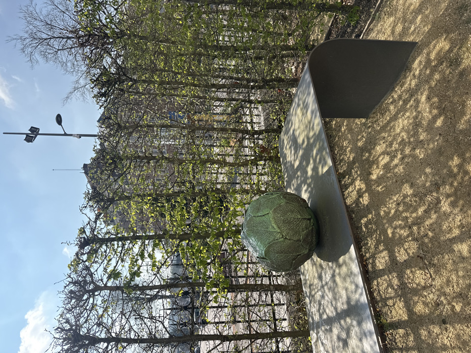 The image displays an outdoor scene in Beauvais, France, under clear blue skies with bright sunlight. In the foreground, a large, spherical sculpture, appearing to be crafted from weathered, verdigris-toned metal with a prominent leaf texture, rests centrally on a dark gray, minimalist metal bench or pedestal. This structure features a flat top surface that curves downward on the right side to meet the light brown, granular ground, which is extensively patterned with dappled shadows from overhead trees and a fence. Behind the sculpture and bench, a dense row of pollarded trees, exhibiting fresh light green spring foliage, forms a verdant screen. Through the gaps in these trees and beyond them, a dark, decorative metal fence with intricate scrollwork is visible. In the background, a multi-story building with numerous windows, constructed from light-colored stone or brick, stands under the sunlight. To the right of the building, a tall, dark street light pole supports multiple directional fixtures and a single street lamp. No people are present in the scene.