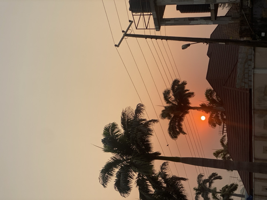 A vibrant sunset paints the sky orange above silhouettes of palm trees. Power lines crisscross the frame, connecting a utility pole and a building structure with a reddish-brown roof. The sun glows brightly through the trees, creating a warm, hazy atmosphere.
