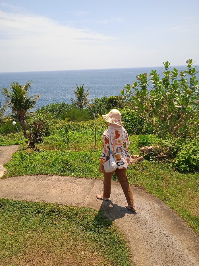 A person in a hat, patterned shirt, and brown pants walks on a concrete path towards the ocean. Lush greenery and palm trees surround the path. The ocean is visible in the background under a clear blue sky. The person carries a white bag over their shoulder. Sunlight casts a shadow on the path.