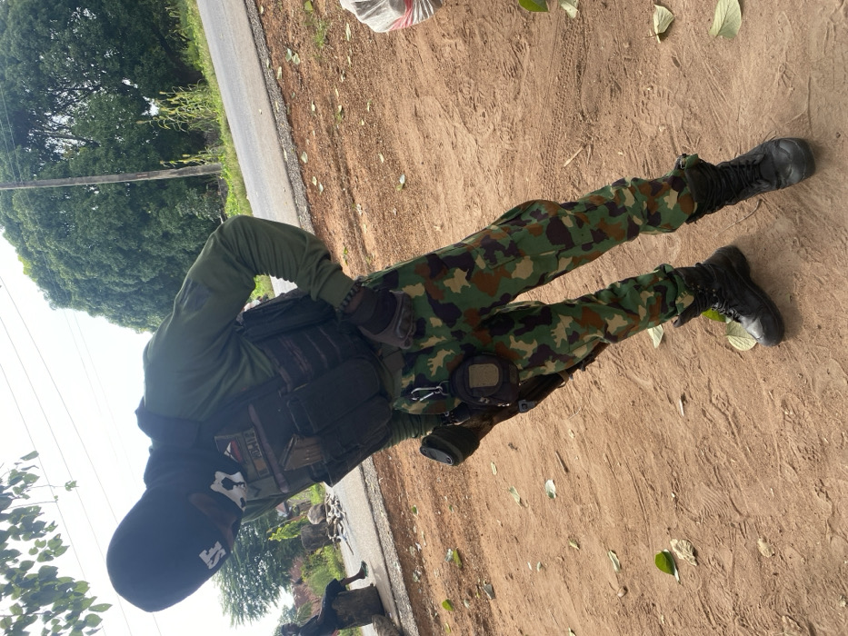 A person is wearing military gear, including camouflage pants and a tactical vest, standing on a dirt and asphalt surface with sparse foliage