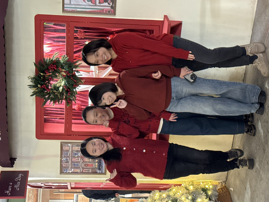 A group of four adult East Asian females is depicted posing in a festive, indoor-like setting in Liangjiang, China. All individuals are smiling and directly facing the camera. They are dressed in varying shades of red tops and dark or blue bottoms. From left to right: 1. A woman with long dark hair, wearing a red textured cardigan, dark pants, and beige boots, forms a 'shaka' gesture with her left hand. 2. A woman with dark hair tied back, in a red embroidered top, dark wide-leg pants, and dark patent shoes, touches her left hand to her chin. 3. A woman with a dark bob haircut, wearing a dark red hooded sweatshirt, light blue wide-leg jeans, and dark flat shoes, makes a 'peace' sign with her right hand and holds a dark smartphone in her left. Her right arm is linked with the adjacent woman's left arm. 4. A woman with short dark hair, wearing a red hooded sweatshirt, dark skinny pants, and light beige sneakers, has her left arm linked with the adjacent woman's right arm. The background features a light-colored wall serving as a facade. A central red-painted window frame is decorated with a large green and red berry Christmas wreath. Red curtains and ornaments are visible within the window. To the left of the window, a framed picture of a building and a small black sign with "Have a Nice Day." in white script are visible. A portion of a lighted artificial Christmas tree stands on the far left. The floor is light gray. The environment is illuminated by consistent artificial lighting.