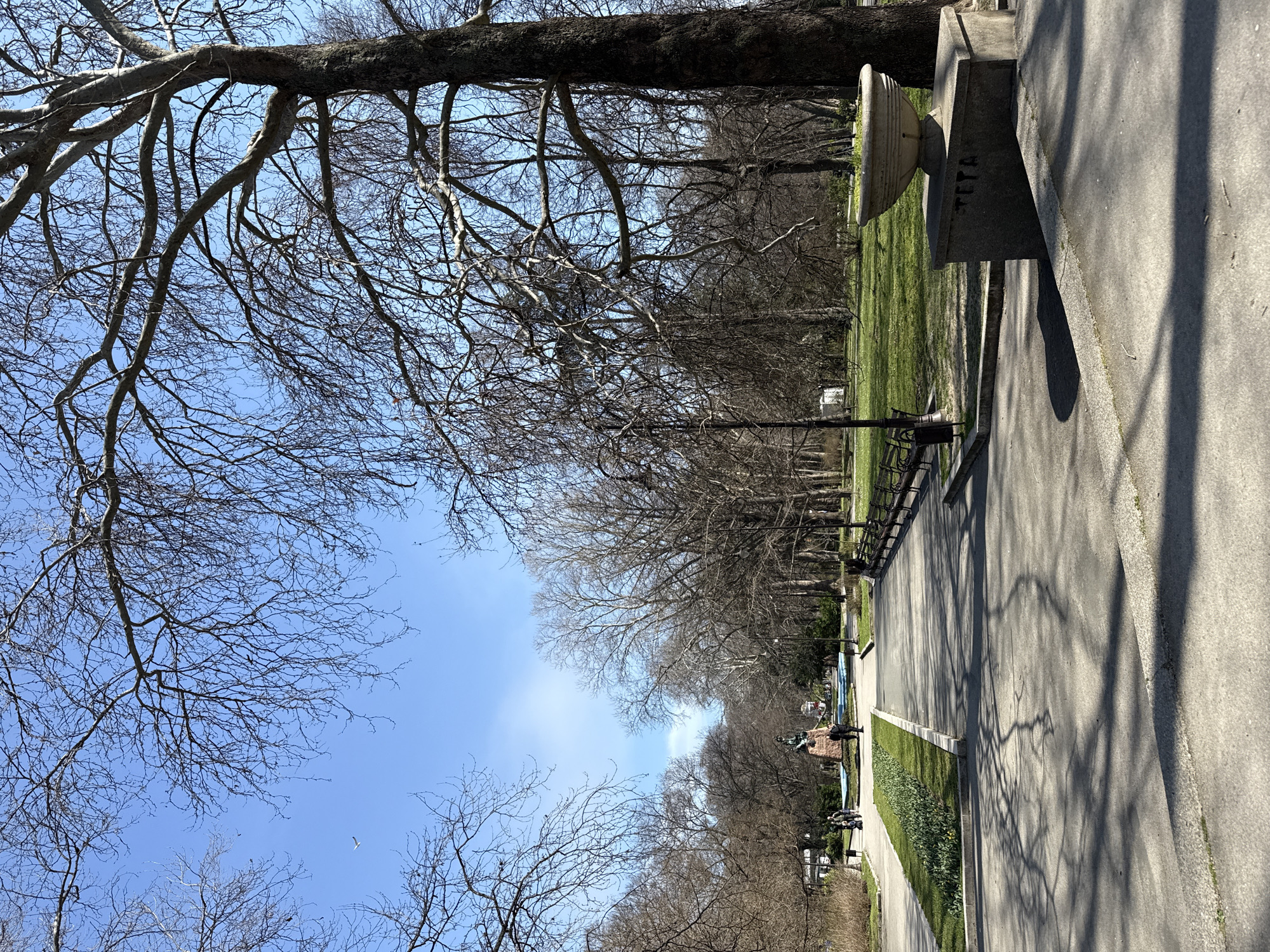 An outdoor scene depicts a public park, identifiable as the Sea Garden in Varna, Bulgaria, under a clear, bright blue sky. Numerous deciduous trees with bare branches dominate the upper and middle ground, casting intricate shadows across grey concrete pathways. A large, dark-barked tree trunk is prominent on the far right. In the immediate foreground on the right, a grey concrete pedestal with the etched inscription "ТЕТА" supports a fluted concrete planter containing small green plants. The main pathway, covered in tree shadows, recedes into the distance, flanked by green lawns. A linear flowerbed alongside the left path displays early spring growth, including small green plants and yellow flowers, consistent with daffodils or early tulips. Several dark-colored park benches are arranged along the right edge of the main pathway. In the middle distance, a bronze-colored statue on a stone pedestal stands centrally, positioned near a light blue fountain basin. Several individuals are present: two individuals, one pushing a stroller, walk on the path to the left of the flowerbed; one individual stands near the base of the central statue; and another person is visible further back near the fountain. Dark streetlights are interspersed throughout the park. A single light-colored bird is in flight in the upper left portion of the sky. The overall environment suggests a sunny day in late winter or early spring.