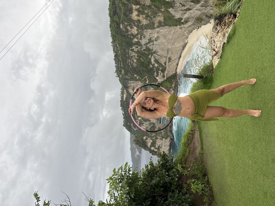- "A lone adult female stands barefoot on a bright green artificial turf patch, posing with a black and pink hula hoop held above her head, arms bent, and hands clasped" by FM-QYAUi2, licensed under CC BY 4.0