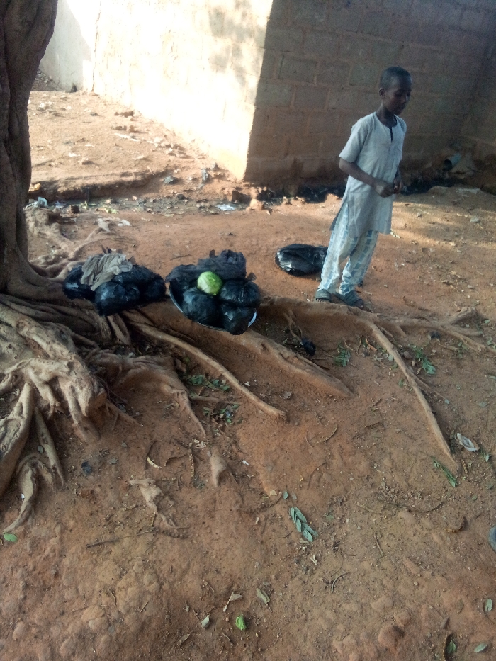 The image depicts an outdoor scene in Jushi, Nigeria, characterized by dry, reddish-brown soil covering the ground. On the left, a large tree trunk is visible with numerous exposed, gnarled roots extending across the foreground. Resting among these roots are several black plastic bags. One collection of bags, piled on a round, metallic tray or bowl, prominently features a light green melon or similar fruit on top. Another pile of black bags is situated next to the tree roots, with a light-colored fabric draped over one. Further back on the right, a single black plastic bag rests on the ground. A young male individual, appearing to be a child or adolescent, stands on the right side of the frame, facing slightly left. He wears a light-colored, long-sleeved tunic over patterned trousers and dark sandals. His hands are positioned in front of him at waist level. In the background, a light-colored wall, possibly constructed from concrete blocks or bricks, is partially illuminated by sunlight, with shadows indicating the sun's position. Scattered debris and sparse dried leaves are visible on the ground. The scene is illuminated by natural daylight.