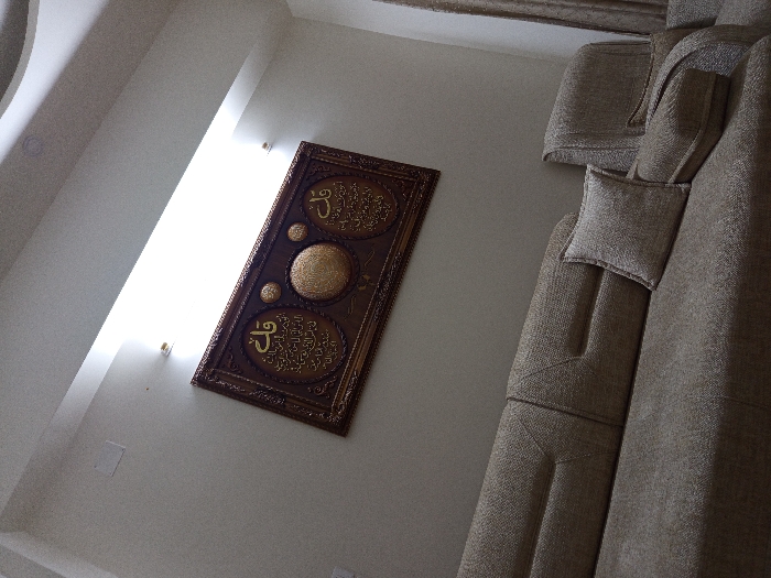 The image depicts an interior residential space, likely a living room, located in Zamalka, Syria. A large, ornate rectangular framed piece of Islamic calligraphy, featuring dark brown wood or metal with gold-toned Arabic script, is centrally mounted on a light beige wall. The calligraphy includes three circular elements, two of which are adjacent to larger script sections beginning with "قل" (Qul). Directly above the frame, two small, gold-colored wall-mounted light fixtures emit upward illumination, highlighting a white, multi-tiered ceiling with a recessed lighting channel. A segment of a large, light brown textured fabric sofa occupies the lower half of the frame, including an armrest and backrest sections, with one matching square cushion visible. A portion of a light brown curtain is visible on the right edge of the image. No individuals are present in the scene.