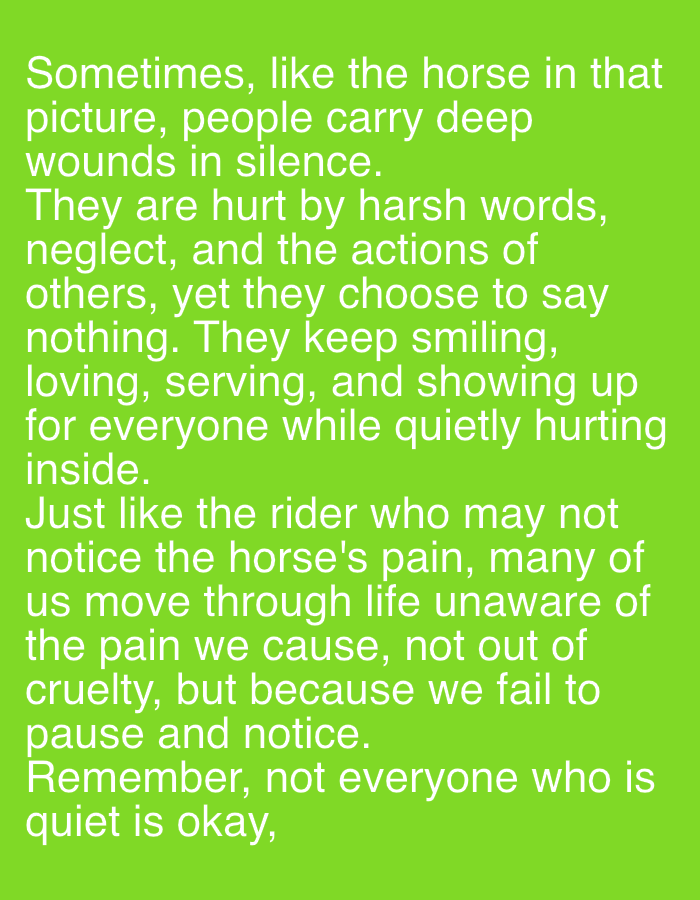 The image displays white text rendered against a solid lime green background. The text comprises four paragraphs, positioned centrally within the frame. The content is an English-language message reflecting on silent emotional suffering, being hurt by words and neglect, and the unconscious infliction of pain upon others. It refers to a non-present "horse in that picture" and a "rider." There are no people, animals, specific physical objects (other than the text characters themselves), actions, or interactions visually depicted in the image. The environment is a uniform digital background of a specific lime green hue. The image data provides no visual information to determine its physical location in the city of Jos, Nigeria, or any other geographical area.