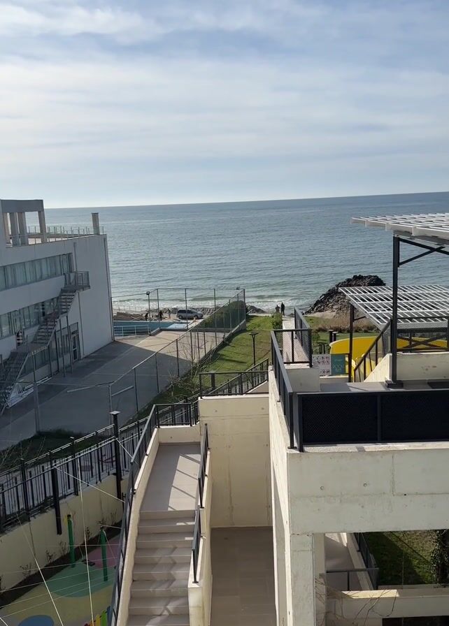 n exterior view overlooking a water park next to the ocean. The water park is currently closed, with visible water slides and structures. To the left, there is a white building with visible staircases and windows. A fence surrounds the park area. In the background, the ocean stretches to the horizon under a partly cloudy blue sky. Two people are walking along the beach. The camera slowly pans from left to right.