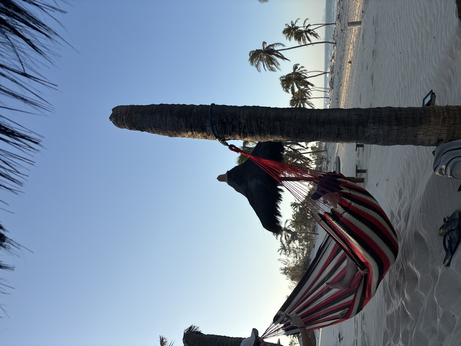 This image depicts a sandy beach scene under clear daylight conditions with warm illumination, located in Caucaia, Brazil. In the foreground, a striped hammock, predominantly red, black, white, and gray, is suspended between two large palm tree trunks. A person is lying in the hammock, with their bare legs visible on the left side and their head, partially obscured by a hat, visible on the right. Below the hammock, on the light-colored sand, a pair of black flip-flops rests on the left, and a light-colored backpack or bag is positioned near the base of the right palm tree. An electronic device, resembling an e-reader or small tablet, is placed on a dark surface attached to the right palm tree trunk. In the mid-ground, to the left of the right palm, a dark, thatched umbrella structure is visible. Numerous additional palm trees are scattered across the sandy landscape, extending towards the distant ocean on the right. The ocean exhibits minimal wave activity, meeting a clear horizon line under a light blue sky. Overhead, blurred palm fronds partially frame the top of the image.