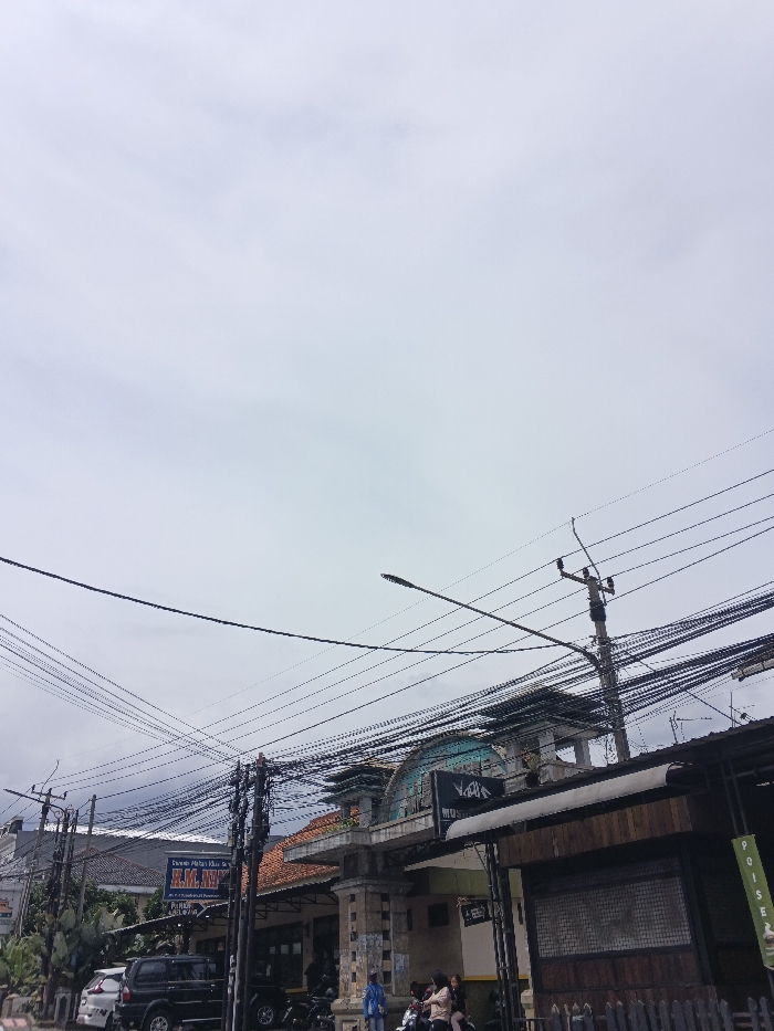 An urban scene under an overcast sky features a jumble of overhead power lines. A street lamp and utility pole are on the right, adjacent to a building with an ornate archway. A sign with the word "MOSE" is visible on the arch. Below, cars and motorcycles are parked, and people are standing on the sidewalk. A restaurant or shop with a wooden fence is in the foreground.