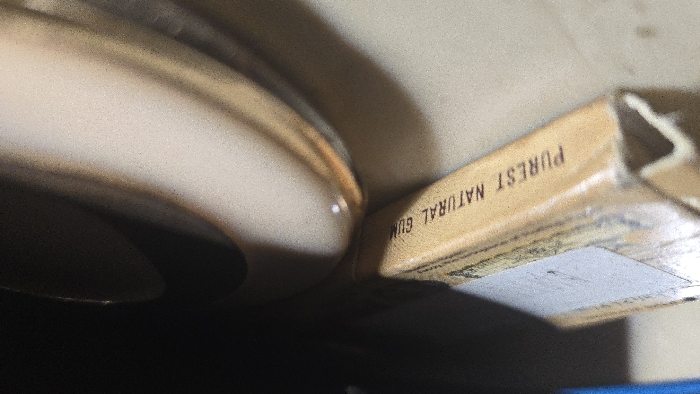 The scene depicts a close-up view of two distinct objects on a light-toned, textured surface. On the left, a partially opened, light-brown rectangular package or wrapper is visible. The visible text on its side reads "PUREST NATURAL GUM". A light-colored rectangular label is affixed to its top surface. To the right of the package, a smooth, curved, light-beige object, exhibiting a reflective, golden-toned rim, occupies the foreground. This object suggests a portion of a larger circular or oval form. The background is dark and indistinct, indicating limited illumination. A defined shadow is cast by the curved object onto the supporting surface. No individuals, actions, or interactions are present. The location of this scene is the city of Lompoc, United States.