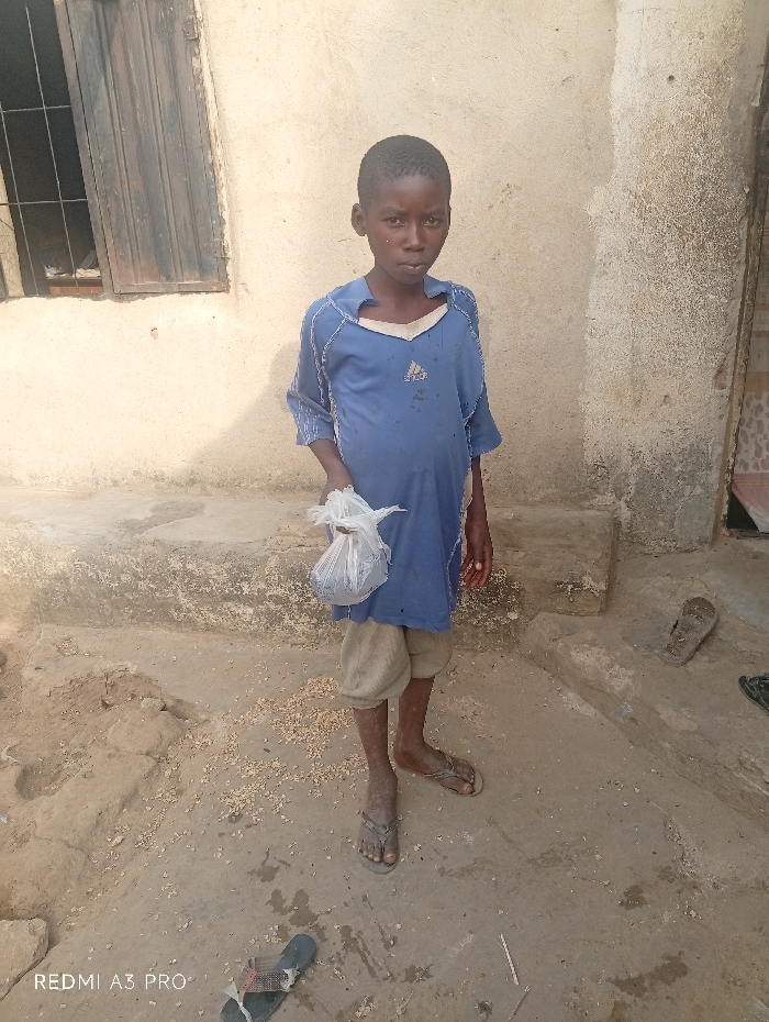 A young male, appearing to be a child, stands upright, centered in the frame, facing the camera directly in Akwanga, Nigeria. He wears a faded blue, long-sleeved tunic with visible tears around the neckline and shoulders, over light-colored, possibly beige, trousers that extend to just below the knees. Grey-brown flip-flops are worn on both feet. In his left hand, he holds a clear plastic bag containing numerous small, dark, granular objects. The background consists of a textured, light-brown plastered wall, appearing aged. To the left, a window with dark wooden louvers or shutters, partially closed, is set into the wall, revealing metal bars behind. The ground is an uneven, compacted dirt or concrete surface, strewn with small, light-colored fragments resembling grain or wood chips, particularly around the subject's feet and to his left. Concrete steps or a raised platform are visible to the right and behind the subject. An additional pair of dark-colored flip-flops lies on the ground in the foreground to the left, and another single flip-flop is visible further back on the right. A thin, dark, stick-like object also lies on the ground near the subject's feet. A vertical plastered column or doorway structure is partially visible on the far right.