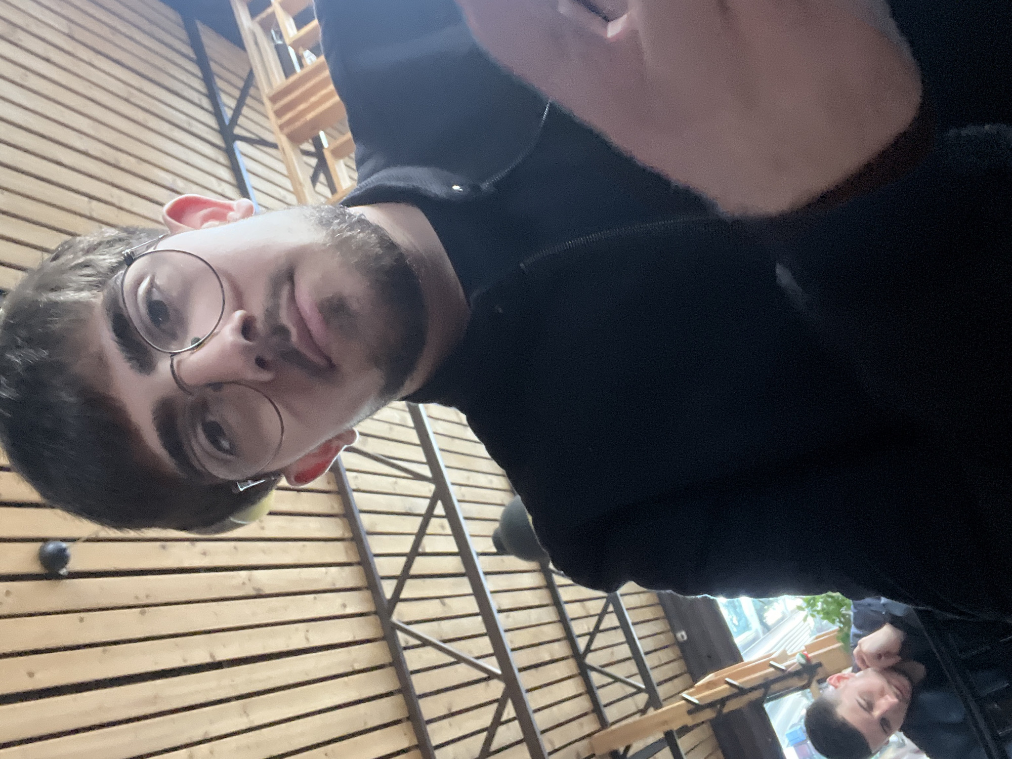 An unidentified modern dining establishment in Sofia, Bulgaria, is depicted from a low-angle perspective, likely a selfie. The primary subject is a young adult male, positioned centrally and looking directly at the camera. He has short dark hair, a light beard/stubble, and wears round, metal-rimmed glasses. He is dressed in a dark (presumably black) jacket with a zippered front, over a dark shirt or turtleneck. His right hand is partially visible in the bottom right corner, suggesting he is holding the camera. In the blurred background to the lower left, a second male individual is visible, appearing to be seated at a table and looking downwards or away from the camera. This individual has short dark hair and wears a dark top. The establishment's interior features a distinctive ceiling composed of light-toned wooden slats arranged linearly. Beneath these slats, dark-colored metal beams form a structural truss pattern. A dark, bell-shaped light fixture hangs from the ceiling. To the left, behind the second individual, a window or glass panel offers a blurred view of an exterior with green foliage and what appears to be a light-colored awning or structure. Additional light-colored wooden posts or dividers are faintly visible in the midground, contributing to the establishment's decor. The overall lighting suggests an indoor setting, possibly an enclosed terrace or main dining area.