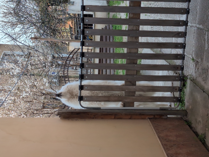 - "A large, white, long-haired dog is observed standing upright on its hind legs, with its forepaws resting on the top horizontal rail of a dark brown wooden slatted gate" by FM-7gdNZ2, licensed under CC BY 4.0