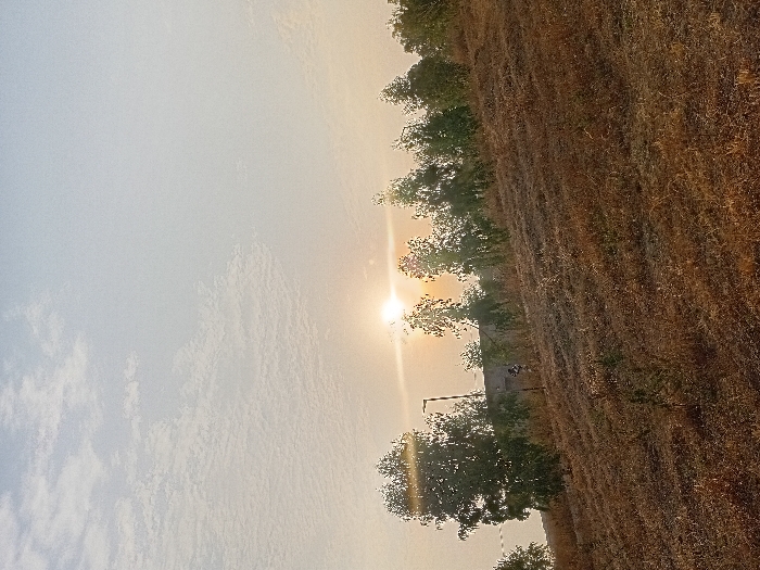 A dry field stretches to the right of the frame, its golden-brown hues indicating sparse vegetation. Trees line the edge of the field, their foliage silhouetted against the sky. The sun is positioned high, its radiant glow piercing through the atmosphere. The sky is pale, with faint clouds adding texture. The overall scene conveys a sense of dryness and heat, suggesting a hot climate or season.