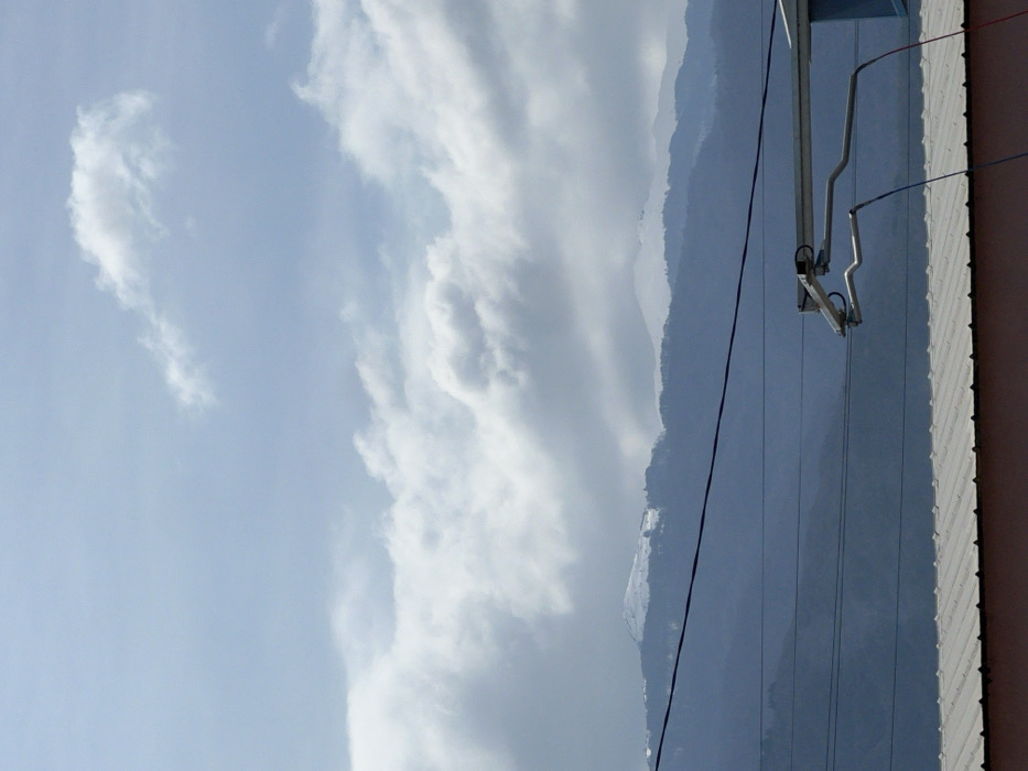 The scene is an exterior long shot in Petrich, Bulgaria, presenting a view of mountains beneath a partly cloudy sky. The upper two-thirds of the image feature a light blue sky with scattered white cumulus and grey stratiform clouds. A layered range of mountains, dark blue-grey in color and showing atmospheric haze, occupies the mid-ground. The upper slopes and peaks of these mountains, particularly a prominent summit towards the left, are covered in snow. Multiple dark horizontal utility wires or cables traverse the frame in the mid-ground, positioned in front of the mountain range. The lower third of the image depicts the top portion of a building, characterized by a corrugated metallic roof. Below the roofline, a segment of a reddish-brown wall is visible. On the right side, a light-colored, multi-segmented metallic arm or bracket extends into the frame over the roof, from which a blue and a reddish cable descend. No individuals or specific actions are present within the frame.
