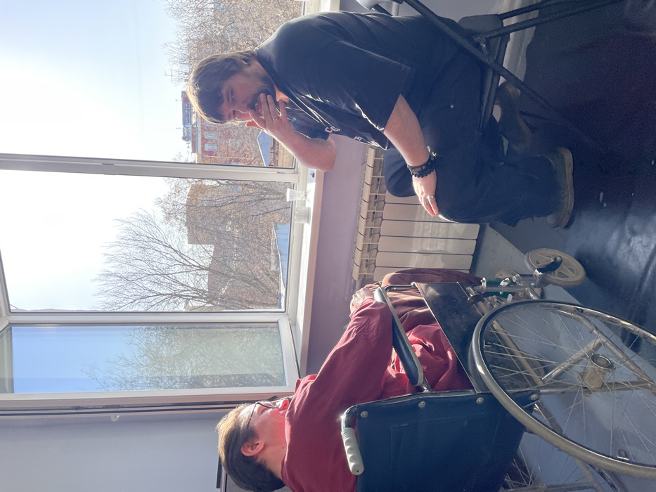The image depicts an indoor scene within an urban setting in Moscow, Russia, observed through a large window. Two men are interacting, seated opposite each other. On the left, a man with short dark hair and eyeglasses, dressed in a maroon long-sleeved shirt and matching trousers, is seated in a manual wheelchair. He is positioned with his back partially to the camera, looking towards the man on the right. On the right, a man with shaggy dark hair and a beard, wearing a black short-sleeved t-shirt and dark trousers, is seated on a black folding chair. His right hand is raised to his mouth, with his thumb and index finger near his lips; a silver-colored ring is visible on his right ring finger. A dark beaded bracelet is on his left wrist. He is looking towards the man in the wheelchair. The room features light-colored walls and a dark floor. A large, white-framed window dominates the background; the left pane is slightly ajar, while the right pane is closed. A white windowsill runs beneath the window, holding two white cups, one clear glass, and a small dark object. Below the windowsill is a white, multi-finned radiator. Bright sunlight streams through the window, illuminating the scene and casting shadows on the floor. The exterior view from the window shows a clear blue sky, bare deciduous trees, and several multi-story buildings, characteristic of an urban landscape in Moscow. One building in the mid-distance has a reddish-orange facade, and a light blue roof is visible closer to the foreground. The lack of foliage on the trees indicates late autumn, winter, or early spring.