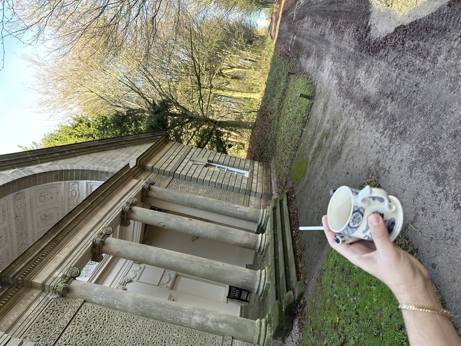The image captures an outdoor scene at the Temple of Diana within Shugborough Estate, near Stafford, United Kingdom, under a clear, light blue sky. A neo-classical stone building dominates the left and central parts of the frame, presenting a portico with four fluted columns, topped with Ionic capitals, supporting an ornate frieze and a coffered ceiling. Stone steps, partially covered in moss, lead up to the portico. A dark, slatted bench is positioned under the portico to the left. The building's exterior walls are constructed with distinct horizontal courses, and a single white-framed window is visible on its right side. To the right of the building, a wide, unpaved dirt track, marked with tire impressions, extends into the background. Both sides of the track are lined with numerous deciduous trees, mostly bare of leaves, alongside some evergreen foliage, including a tall conifer immediately adjacent to the building. The ground in the foreground consists of sparse grass and exposed dirt. In the lower right foreground, a human hand, exhibiting a light skin tone and adorned with a gold chain bracelet on the wrist, holds an off-white ceramic mug decorated with blue patterns. A white straw or stirring stick protrudes from the mug's opening.