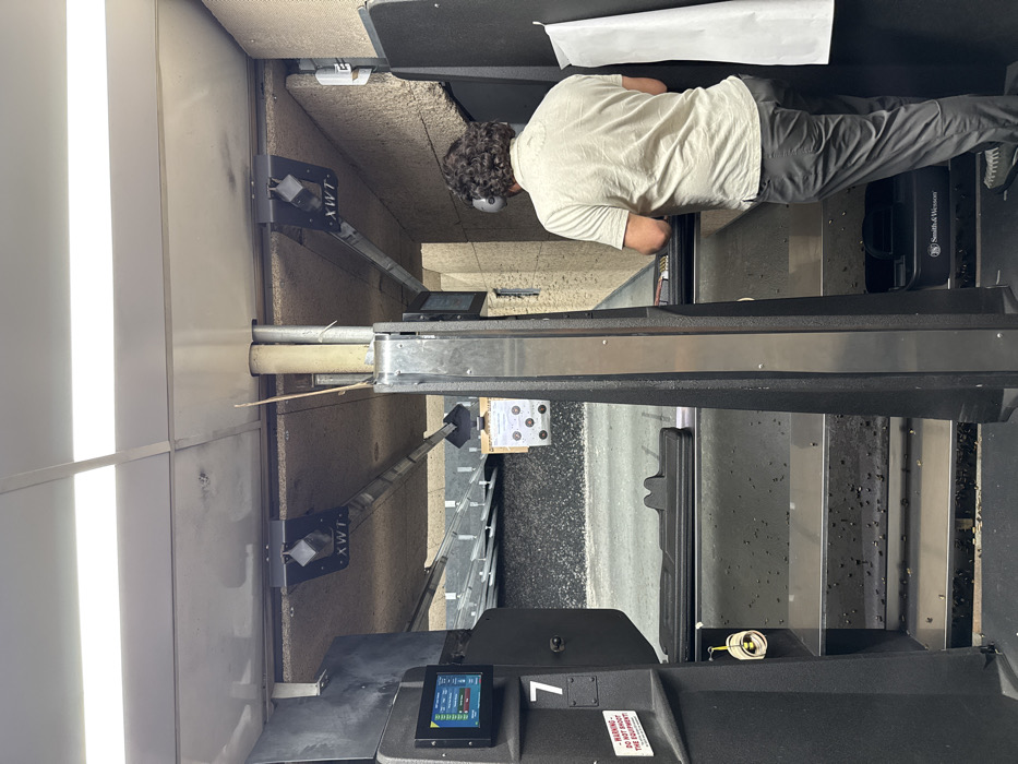 An indoor shooting range is depicted, viewed from behind a firing lane looking downrange in San Diego, United States of America. The scene features a single adult male, observed from the back, positioned at firing lane number 7. He has brown, curly hair and is wearing a light-colored polo shirt, dark gray trousers, and grey over-ear hearing protection. His hands are near the dark-colored bench at the firing line. To his right, on the floor, a black gun case bearing 'Smith & Wesson' branding is visible. The firing lane itself consists of robust, dark dividers, with lane 7 marked prominently on the left divider. A digital control panel with a blue and green interface is mounted on this divider. A yellow coiled cord and a red-on-white warning sign stating 'WARNING DO NOT SHOOT THE EQUIPMENT' are also affixed to the left divider. The bench at the firing line, as well as the immediate floor area, is covered with dark debris, consistent with spent bullet casings or rubber granules. Overhead, a target retrieval system with metallic tracks, branded 'XWT', extends downrange. A white paper target, showing multiple bullet impacts, is currently suspended from this system in the middle distance. The backstop of the range is dark and textured, likely a bullet trap. Fluorescent strip lighting illuminates the facility from above. The walls are light-colored and appear to be constructed from sound-dampening materials.