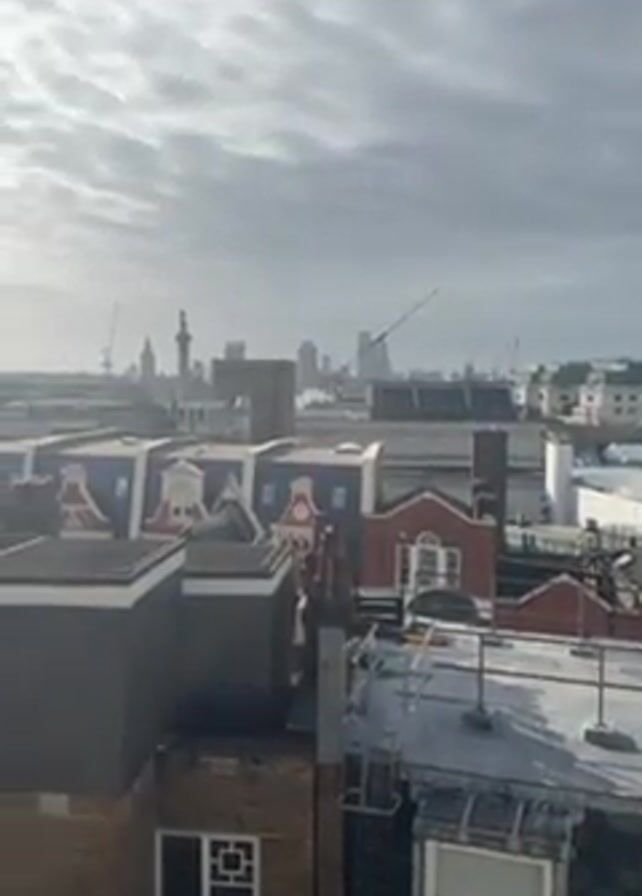 cityscape under an overcast sky with the sun breaking through the clouds. The foreground features rooftops of buildings with varied architectural styles, including dormer windows and chimneys. In the background, landmarks such as the London Eye and other city buildings are visible on the horizon. Cranes dot the skyline, indicating ongoing construction. The general atmosphere appears to be urban and somewhat industrial.