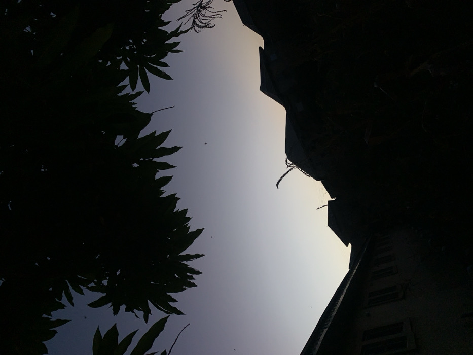The image depicts a twilight scene in Jos, Nigeria. The upper portion of the frame is dominated by the dark silhouette of broadleaf tree foliage, framing a gradient sky that transitions from deep indigo at the top to a pale, yellowish-grey closer to the horizon. Several small, dark, unidentifiable forms, likely birds or insects, are discernible against the brighter sky. The lower half of the image features the silhouettes of multiple residential structures. On the left, a building with a visible light-toned facade includes a row of dark rectangular openings, suggestive of windows. To the right, a cluster of buildings with distinct, angular pitched roofs are rendered in complete silhouette. Tall, spiky vegetation is also visible as dark forms in the immediate foreground, obscuring the base of some structures. No individuals, specific actions, or direct interactions are visible.