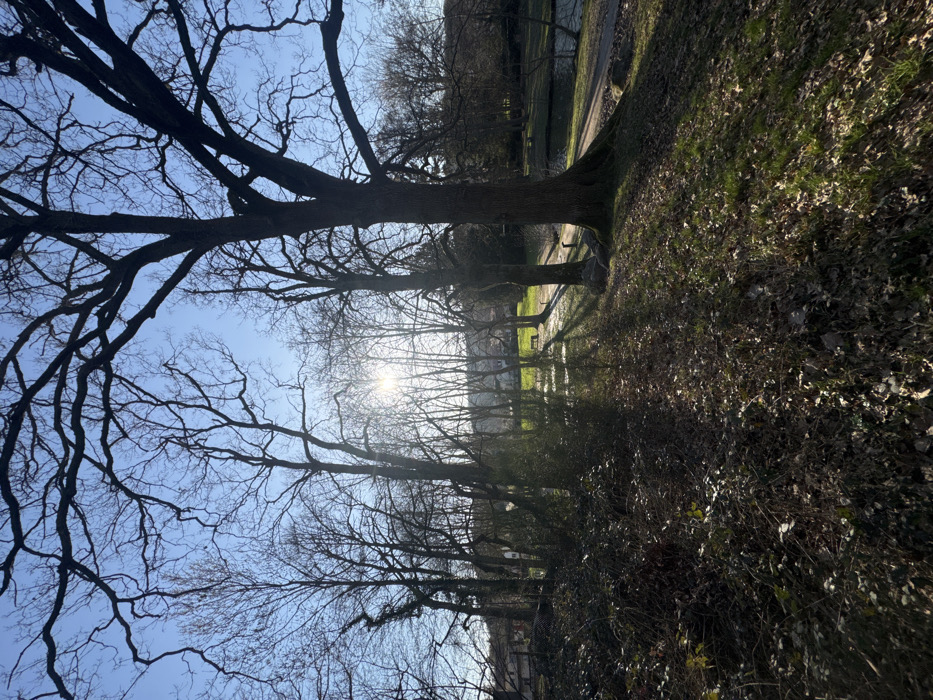 This image displays a park or natural area within Saint-Rémy-lès-Chevreuse, France, under a clear blue sky. The sun, located in the middle-left, creates a bright glare and casts long, sharp shadows across the ground, indicating a low solar angle. Numerous deciduous trees with bare branches are prominent, particularly a large-trunked tree on the right, silhouetted against the sky. The foreground comprises a mix of dense, dark ground cover, dry fallen leaves, and patches of green grass. In the mid-ground, a sun-drenched grassy lawn features a light-colored park bench. A dirt or gravel path is visible to the right of the lawn, running parallel to a narrow body of water, likely a stream or canal. Distant, light-colored buildings are faintly discernible through the tree line in the background. A metal fence is partially visible on the far left. The scene is devoid of any individuals or specific actions.