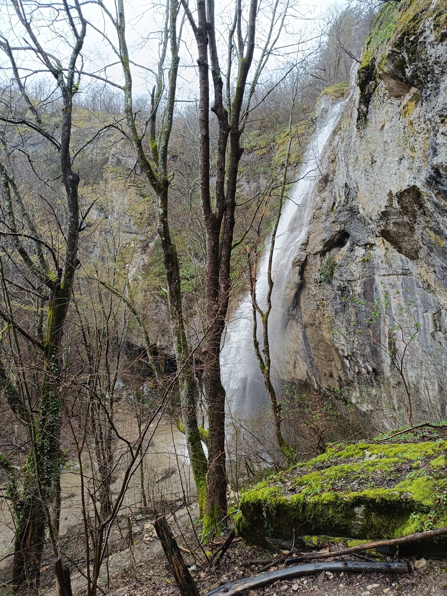 The image captures a scene near Veselinovo, Bulgaria, showcasing a waterfall cascading down a rock face. The foreground is dominated by several bare trees with some moss visible on their trunks. A large, moss-covered boulder sits prominently in the lower right corner. The waterfall itself is slender and appears to be partially obscured by the trees. The rock face is gray and rugged, with some hints of greenery. The environment is likely damp, judging by the moss and wet appearance of the ground. The scene suggests a natural, possibly forested area near the mentioned city.