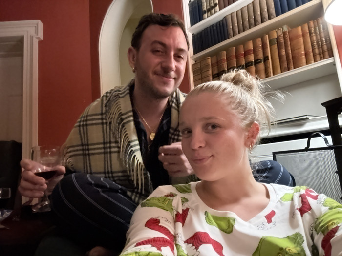 A fair-skinned man with dark hair, wearing a plaid shawl and a gold necklace, sits with a glass of red wine. He smiles slightly. In front of him is a fair-skinned woman with blonde hair in a bun. She wears a white pajama top with Grinch designs. Behind them are dark red walls, a white doorway, and a bookshelf filled with old books.