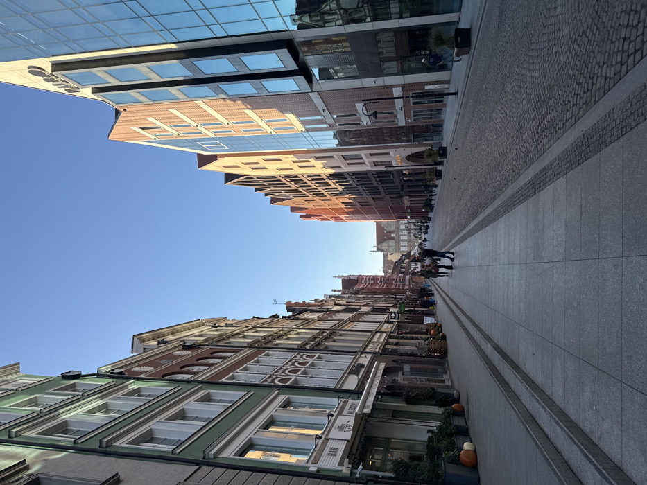 The image depicts a street scene in Gdańsk, Poland, specifically looking down Ul. Stare Mleczarnia within the Old Town. The time is daytime under a clear, bright blue sky, with sunlight illuminating the right side of the street and casting long shadows to the left. On the left, a row of multi-story buildings with traditional Gdańsk architecture lines the street. These structures feature gabled roofs, multiple windows with white frames, and facades painted in varying colors including green, reddish-brown, and cream. Ground-level establishments are visible, with one displaying a sign that includes "BAR MLECZNY". Potted plants and decorative pumpkins are arranged outside these businesses. The pedestrian walkway on this side is paved with light grey rectangular slabs and includes a raised section with two steps. On the right, a blend of modern and contemporary buildings is present. The prominent building in the immediate foreground and mid-ground is a multi-story structure featuring large glass curtain walls that reflect the sky and opposing buildings. A "PURO" logo is visible near its top, identifying it as the Puro Hotel Gdańsk. Adjacent and further down, buildings with modern brickwork and angular gabled roofs emulate the traditional style. The pedestrian area on this side is also paved with light grey slabs, bordered by a dark line. The central roadway is paved with cobblestones and is bordered on both sides by a strip of light grey paving. Scattered pigeons are visible on the cobblestones. In the mid-ground, approximately a dozen individuals are discernible, walking or standing in small groups on the pedestrian paths and near the roadway. Further down the street, additional buildings with traditional gabled roofs create a receding perspective, culminating in a larger, distant historic structure. Streetlights are intermittently positioned along the right side of the road. No specific interactions between individuals are clearly identifiable.