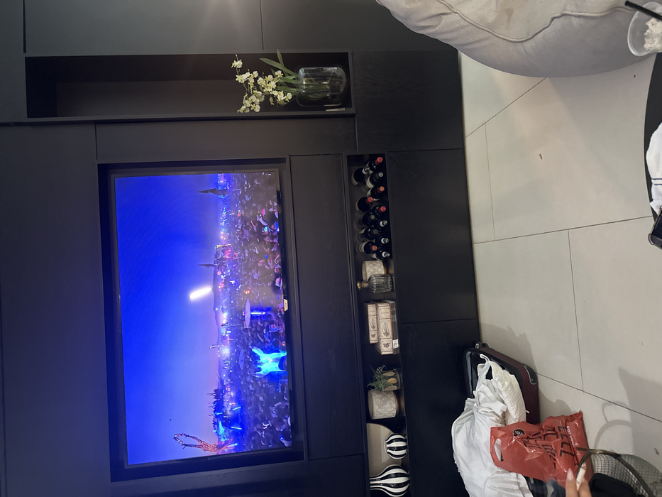 The image displays an indoor living space in Raanana, Israel, featuring a modern aesthetic with dark-toned built-in cabinetry and white square tiled flooring. A large flat-screen television is centrally embedded in the dark entertainment unit, displaying an outdoor music festival or desert rave scene at night. The screen shows a dense crowd of people under a deep blue sky, illuminated by bright blue and white stage lights, with a prominent giraffe-like art installation on the left and a figure in the crowd with raised arms. Below the television, a shelf within the entertainment unit holds several objects: two black and white striped decorative vases, a light-colored textured pot containing a small green plant, two stacked decorative books, a clear glass decanter with a stopper, and a built-in wine rack holding approximately 12 to 15 bottles of red wine. To the right of the television, a vertical recessed shelf displays a clear glass vase containing light-colored flowers, possibly orchids. On the white tiled floor, an open burgundy-colored suitcase is positioned on the left, containing folded white clothing. Next to the suitcase is a red plastic shopping bag bearing Hebrew text, identifiable as "שופרסל" (Shufersal). A human hand with manicured fingernails is visible near the top of the red bag, holding a small, indistinct object. Partially visible on the far right of the frame is a light-colored beanbag chair. A small section of a dark table surface with a clear plastic cup containing a light-colored beverage and a straw is visible in the bottom right corner.