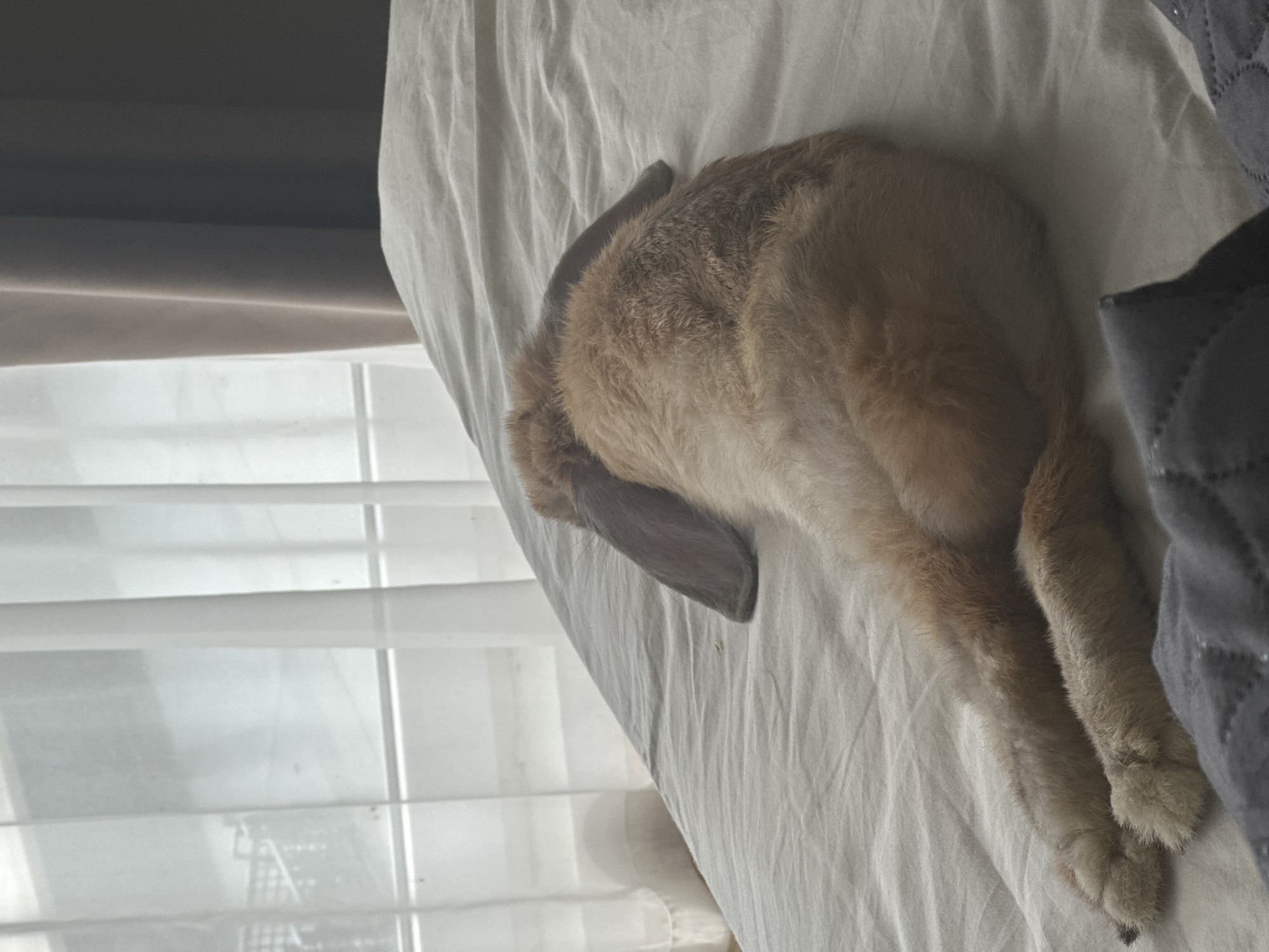 A rabbit is lying on a white sheet next to a window
