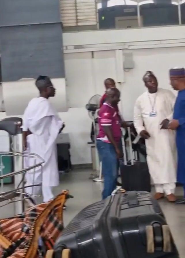 busy airport terminal. Several people are present, some in traditional African clothing and others in casual wear like jeans and T-shirts. They are standing around with luggage. There are several suitcases, carry-on bags and what appears to be a woven blanket on the floor. People are talking to each other. Some are moving around. An airport employee in a white shirt and tie is assisting a woman with her luggage. The terminal's interior appears functional, with tiled floors, a large air conditioning duct near the ceiling and windows letting in natural light. There are posters on the wall, and also framed portraits.