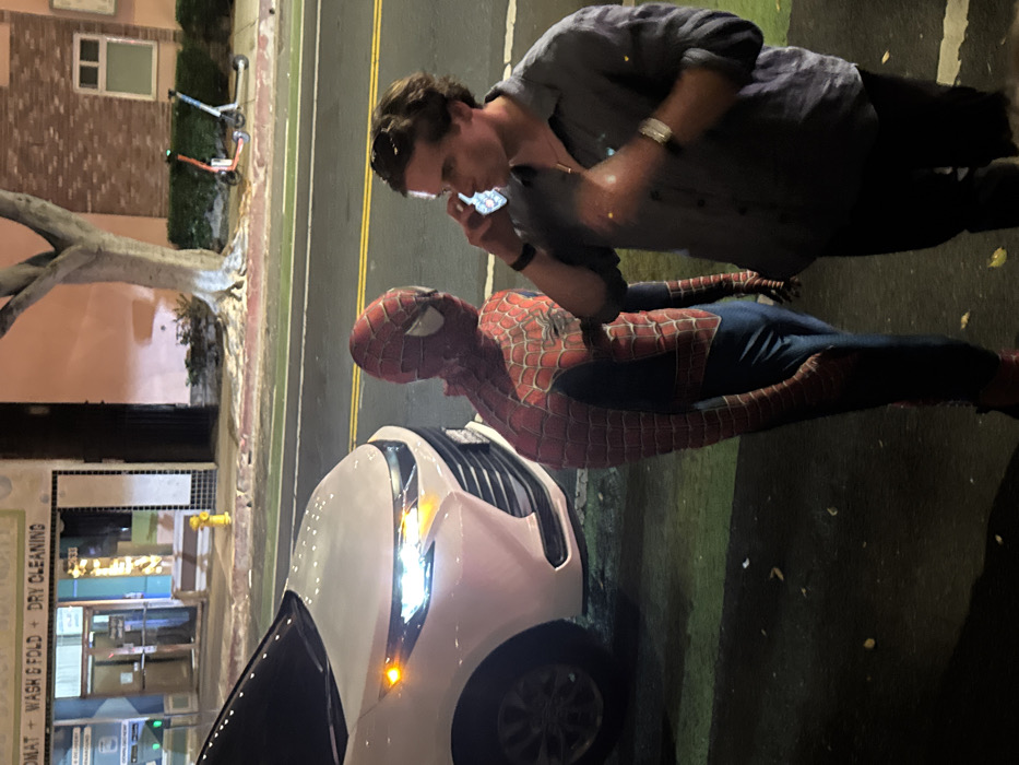 A man in a blue button-down shirt is standing on the sidewalk in front of a white SUV. He is holding a cell phone to his ear and gesturing with his other hand. A person wearing a Spider-Man costume is standing next to him on the sidewalk. The scene is shot at night, and the street is illuminated by streetlights. There are two scooters parked in the background. The location is Santa Monica, California, near the intersection of 2nd Street and Colorado Avenue, based on the provided coordinates.