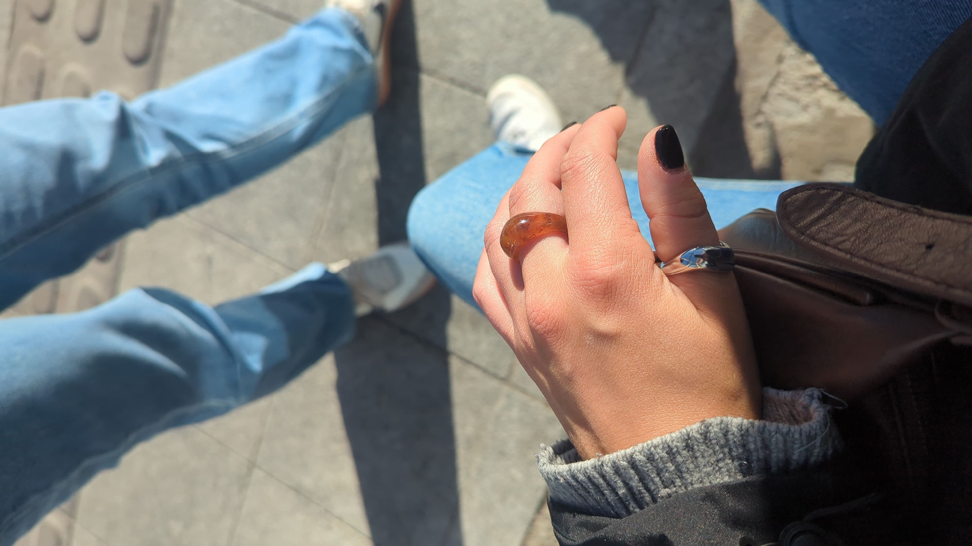 The image depicts a first-person perspective of someone sitting in an urban environment, likely in Dublin, Ireland, indicated by the distinctive paving stones visible under the legs of two individuals. The primary subject is the right hand of the person taking the photo. The hand has short nails painted black. It features two rings: a large, amber-colored ring on the index finger, and a silver ring with a dark stone or detail on the thumb. The hand rests partially on a brown leather bag. The photographer wears a black jacket with a gray knitted cuff. In the background, two other individuals are visible from the knees down. Both are wearing light-blue jeans, and two different pairs of white shoes. The scene is well-lit with strong sunlight casting shadows on the ground. The surroundings appear to be a paved public space, possibly a pedestrian area.