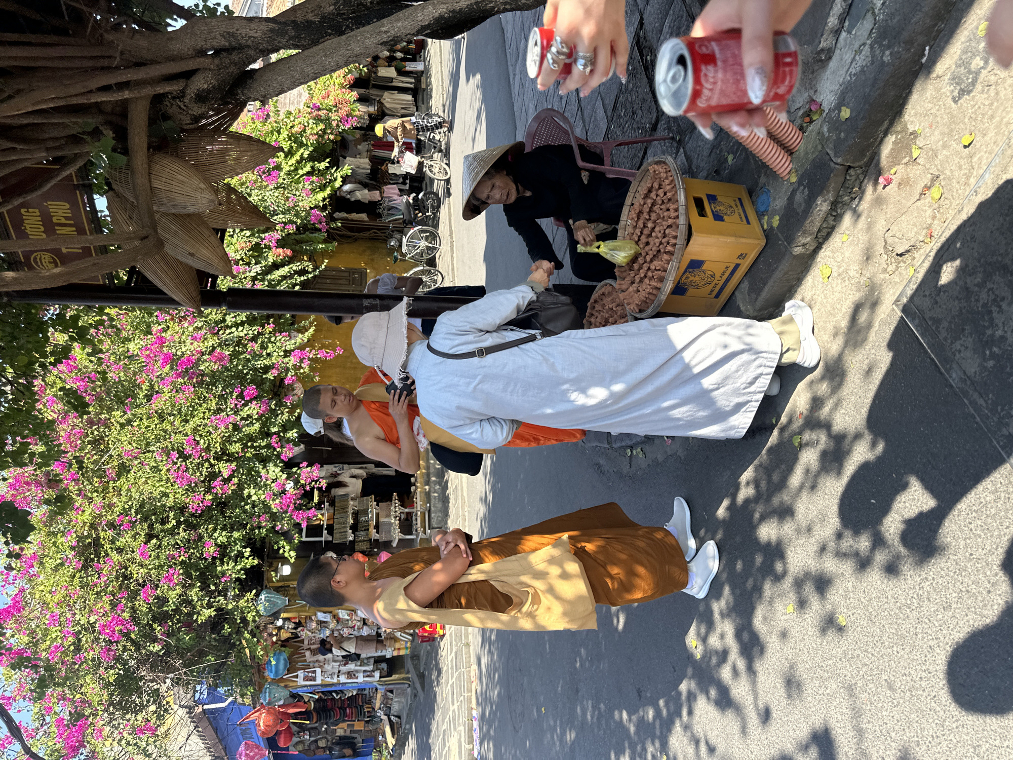 street scene in Hội An Ward, Vietnam. Three Buddhist monks, dressed in traditional saffron robes and white sneakers, are seen walking past a street vendor wearing a conical hat and black clothing. The vendor sits on a small chair next to a container filled with brown items, possibly nuts or snacks. One of the monks appears to be making a purchase. Two hands hold up two cans of Coca-Cola. A tree with purple flowers is in the background, and there are shops and bicycles visible in the distance. The street is paved, and there are shadows from trees and other objects.