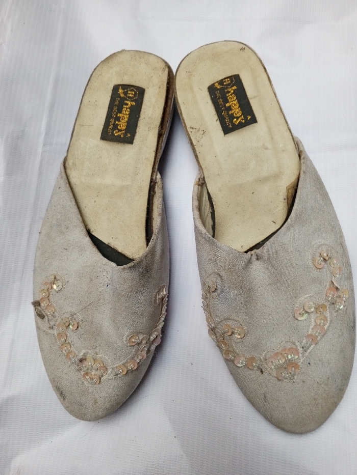 A pair of well-worn, open-back slippers rest on a wrinkled white surface. The slippers are light gray, possibly silk, adorned with delicate, swirling patterns of pale pink sequins. The interior soles are dirty and feature a rectangular black label with gold lettering, readable as "Happy". The slippers show signs of significant wear and tear, including visible dirt, stains, and loose sequins.