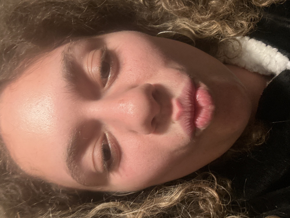 A close-up portrait captures a fair-skinned individual with tightly curled, light brown hair. The face is slightly tilted, highlighting large brown eyes, a prominent nose, and pursed lips with visible texture. The skin appears smooth with subtle highlights. A glimpse of a silver hoop earring is visible. The subject wears a black garment with a white furry collar partially visible. The overall lighting is soft, emphasizing facial features.