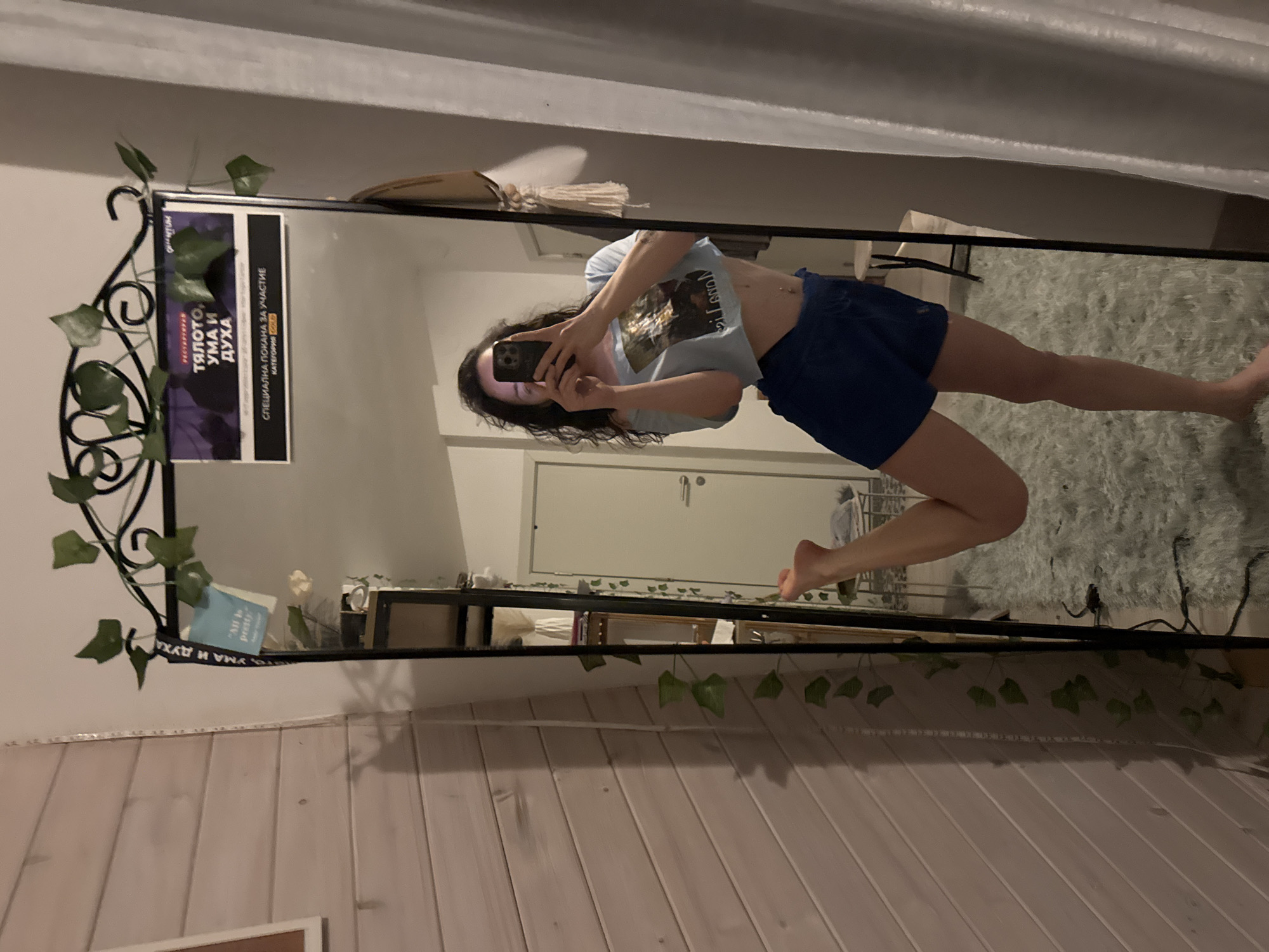 A young woman is visible in the reflection of a large, ornate mirror. She is holding a smartphone, presumably taking a photo of herself. The woman is wearing a light blue t-shirt and dark blue shorts. She is standing on a light-colored rug. The mirror is decorated with artificial vines. In the background is a white door and a shelf containing various objects, including a book with the text "All is pretty". The mirror also reflects an invitation card written in Bulgarian, specifying: "Тялото, УМА И ДУХА СПЕЦИАЛНА ПОКАНА ЗА УЧАСТИЕ КАТЕГОРИЯ" (THE BODY, THE MIND AND THE SPIRIT SPECIAL INVITATION FOR PARTICIPATION CATEGORY). The room appears to be a home interior. There is no information from the image to infer anything regarding the city of Tvarditsa.