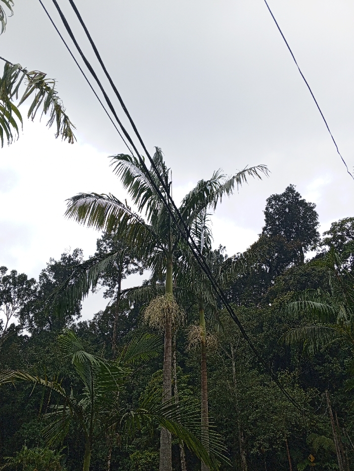 The image captures a lush, green landscape under an overcast sky. Dominating the foreground are two tall palm trees with distinctive, droopy seed pods hanging from their trunks. Overhead, power lines intersect the scene, running diagonally across the frame. Dense foliage of various trees creates a backdrop, suggesting a forest or jungle environment. The overall impression is one of a tropical or subtropical region with an element of human infrastructure.