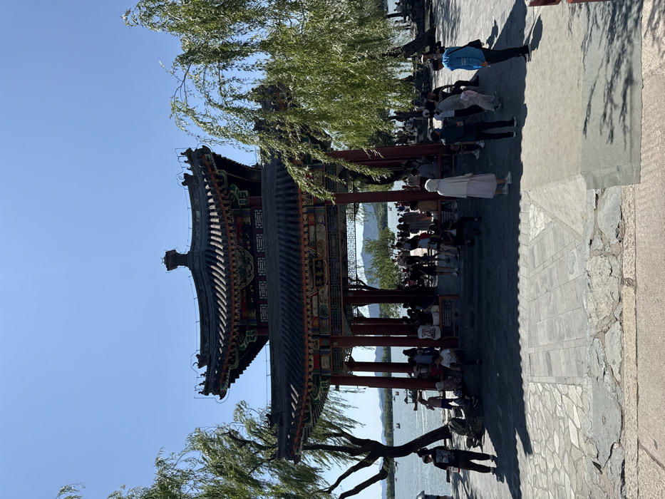 A pagoda-style structure with multiple tiered roofs stands prominently, featuring intricate detailing and vibrant colors. It is partially obscured by a willow tree with drooping branches. People gather around and within the structure, some near the water's edge. The scene is bathed in sunlight, creating sharp shadows on the paved ground. A clear blue sky provides a contrasting backdrop.