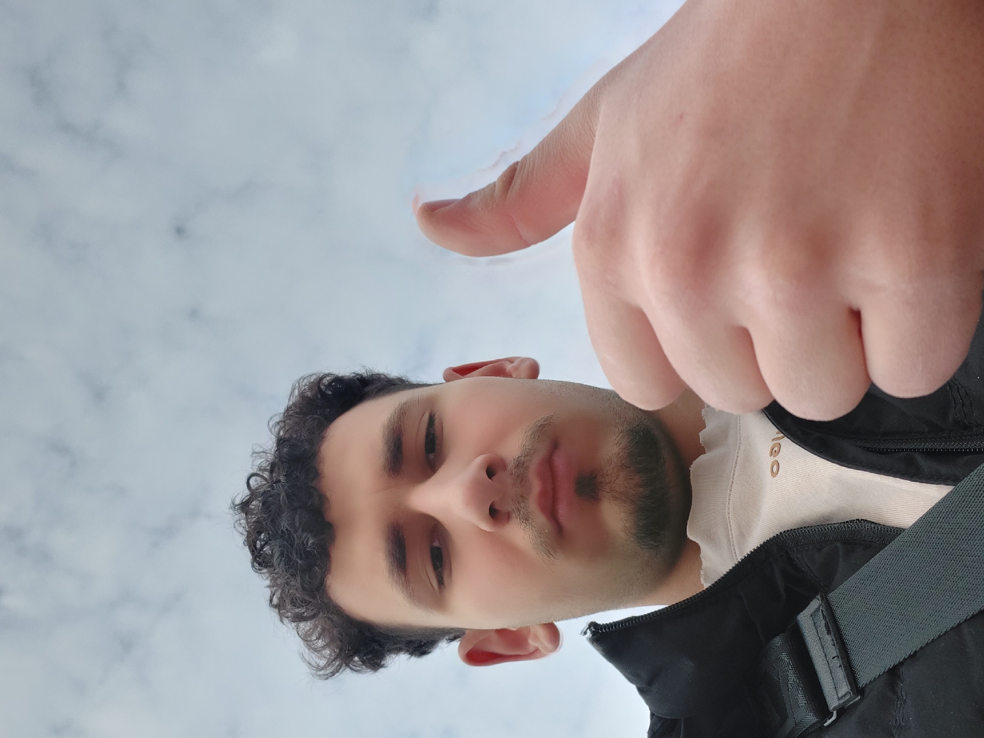 A low-angle selfie captures a young adult male in the city of Gorna Oryahovitsa, Bulgaria. The subject has dark, curly hair, dark eyes, a mustache, and a soul patch. He is wearing a black zippered jacket over a light-colored, high-necked shirt. A black strap is visible over his left shoulder. His right hand is raised in the lower right foreground, giving a thumbs-up gesture. The background consists of an overcast sky with diffused cloud cover.