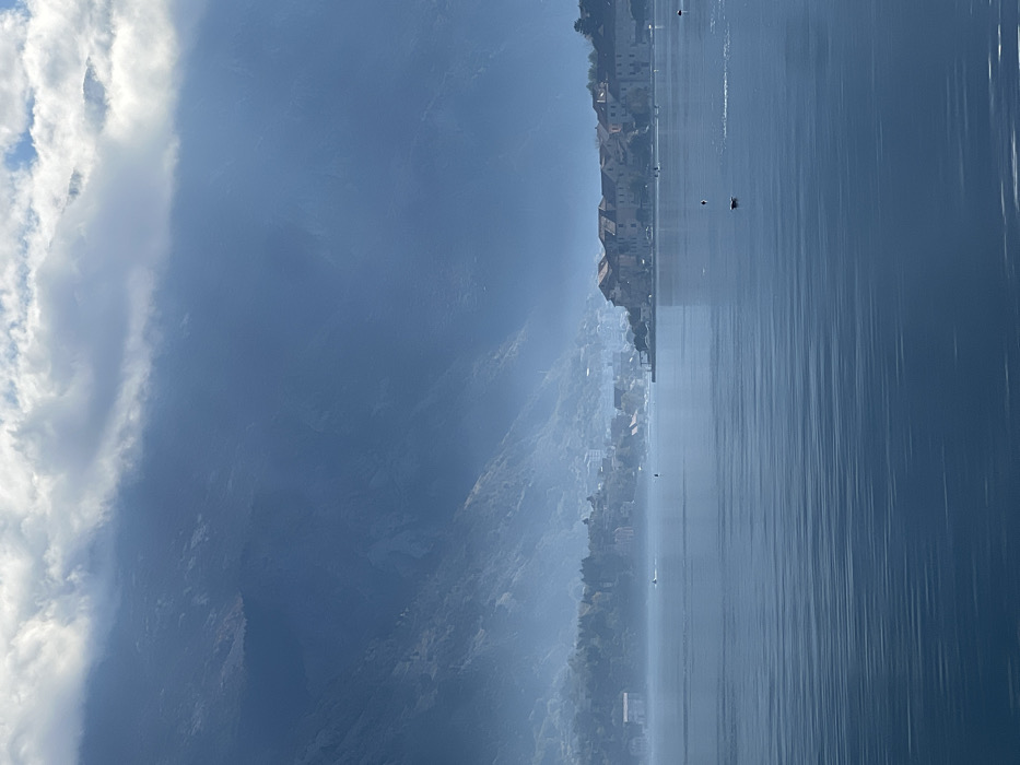 The image displays a wide-angle view of the Bay of Kotor, Montenegro, observed from the vicinity of Bogdašići. The foreground consists of calm, blue-grey water with subtle ripples, reflecting the atmospheric conditions. Several dark, small objects, consistent with buoys or debris, are visible floating on the water's surface. In the midground, a series of human settlements line the distant shoreline. To the right, a cluster of buildings with terracotta roofs is situated on a peninsula, appearing relatively distinct. Further to the left, a more extensive town is partially obscured by a pervasive blue-grey atmospheric haze. A small, dark-hulled boat is observed in motion on the water in the left-mid section, producing a minimal wake. The background is dominated by towering, rugged mountains rising directly from the bay, heavily shrouded in the aforementioned atmospheric haze, which obscures detailed features and gives them a uniform blue tone. The upper portion of the sky features scattered white cumulus clouds against a lighter blue, indicating broken cloud cover and filtered sunlight. No individuals are discernible.