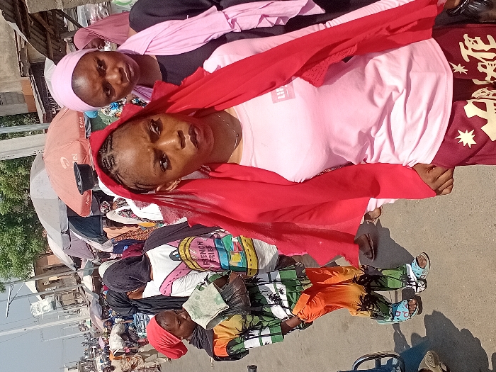 Several people are gathered on a sunny street. Two women take center stage, one in a pink top with a red scarf, the other behind her with a light purple head covering. Market umbrellas dot the background. The atmosphere appears bustling, possibly a market day, with people dressed in a variety of colorful clothing. The image is slightly tilted, offering a candid snapshot of everyday life in an outdoor setting.
