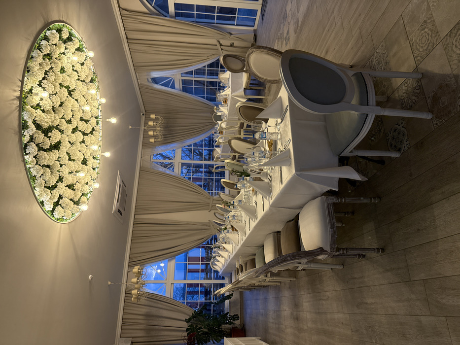 The image depicts a meticulously arranged, empty banquet hall or restaurant dining area, located in Razgrad, Bulgaria. No individuals are present in the scene. A long, rectangular table, draped in a white tablecloth, dominates the left and central foreground. This table is fully set with numerous white folded napkins, individual place settings including cutlery, clear glassware, and water bottles. Small dishes containing what appear to be appetizers or condiments are also visible on the table. Complementing this table are multiple ornate chairs featuring light-colored upholstered seats and intricately carved frames. In the mid-ground and background, several smaller, similarly draped and set tables, both rectangular and round, are visible, surrounded by additional chairs. The flooring in the foreground consists of light-toned, wood-patterned tile, transitioning to decorative patterned tiles in the background. Overhead, a prominent, large circular ceiling fixture is densely adorned with numerous white artificial flowers, from which multiple exposed Edison-style light bulbs descend, providing illumination. Two additional chandeliers with drum-shaped fabric shades are visible in the mid-ground. An air conditioning unit is mounted on the ceiling. Multiple large arched and rectangular windows, draped with light beige curtains, line the walls, allowing natural light into the space. The view outside suggests an evening or early morning scene with a blue sky visible and bare tree branches. A large potted plant, resembling a Monstera, is positioned in the far left foreground. The overall environment is one of prepared elegance, awaiting an event.