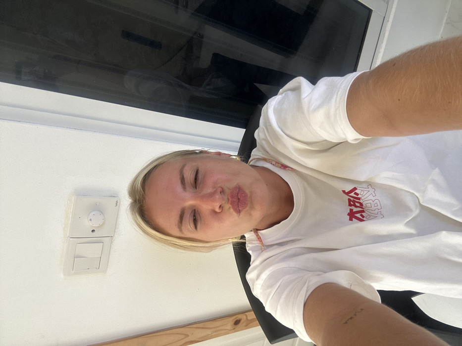 A blonde woman in a white t-shirt puckers her lips towards the camera. She is indoors, seated in a black chair. Behind her is a wall with a light switch and a window. The light switch is white with a dial and a switch. The window is partially obscured by glare. The woman's right arm is visible in the foreground, with a small tattoo on her forearm.