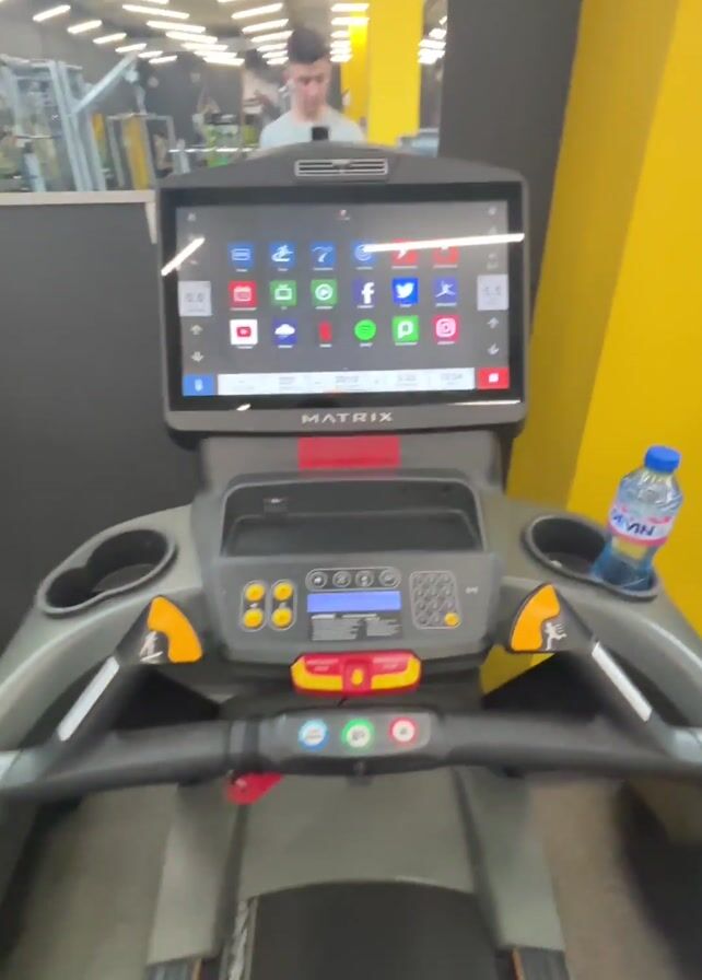 A person is using a Matrix treadmill in a gym. The camera is placed behind the control panel, providing a first-person perspective of someone walking on the treadmill. The treadmill's screen is visible, showing various app icons. A water bottle is in the cupholder, and the person is wearing white sneakers. The background includes yellow and grey walls and other gym equipment.