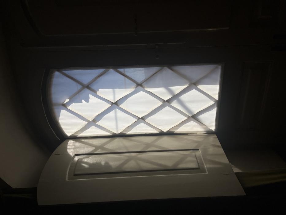 An interior photograph captured in Sintra (Santa Maria e São Miguel, São Martinho e São Pedro de Penaferrim), Portugal, depicts a window and adjacent architectural elements. The room is largely in deep shadow, contrasted by bright sunlight entering through the window. To the left, a white wooden interior shutter is partially open, its inner surface illuminated by direct sunlight, casting linear shadows. The central subject is an arched window, featuring a diamond-patterned grid behind which a translucent white curtain diffuses the incoming light. A distinct dark shadow, resembling a human profile, is cast onto the right portion of this curtain. Additional complex shadows, consistent with external objects or architectural features, are projected across the left section of the window and the open shutter. To the right of the window, a dark, closed wooden door or panel is visible, primarily in shadow, equipped with a metallic handle or latch mechanism. No individuals or active interactions are present in the scene.