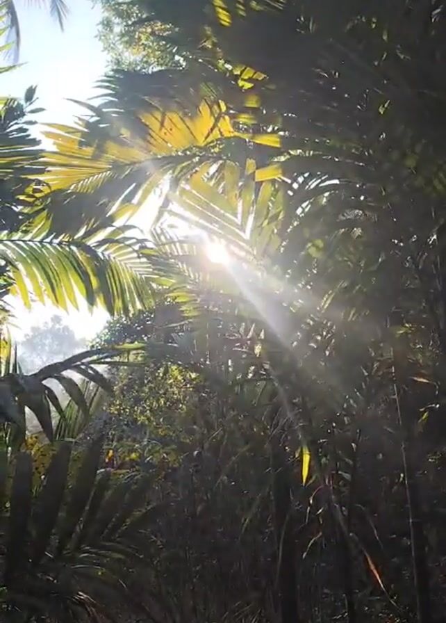 The video depicts a view through a dense array of lush green palm trees, with the sun brightly shining through the foliage